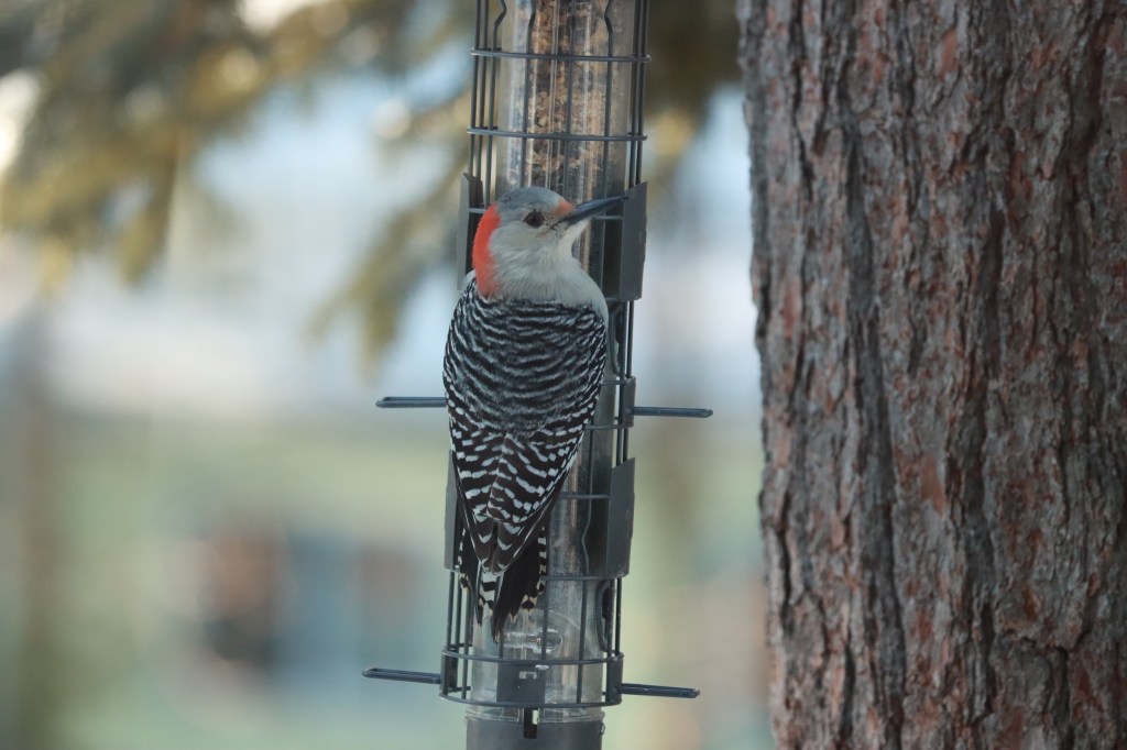 Using my zoom lens like a pair of binoculars, I fixate on a pale-bodied woodpecker with a distinct cherry tomato nape on the back of its head, and black and white checkered wings. It’s not a Hairy or a Downy– the ‘regulars’.