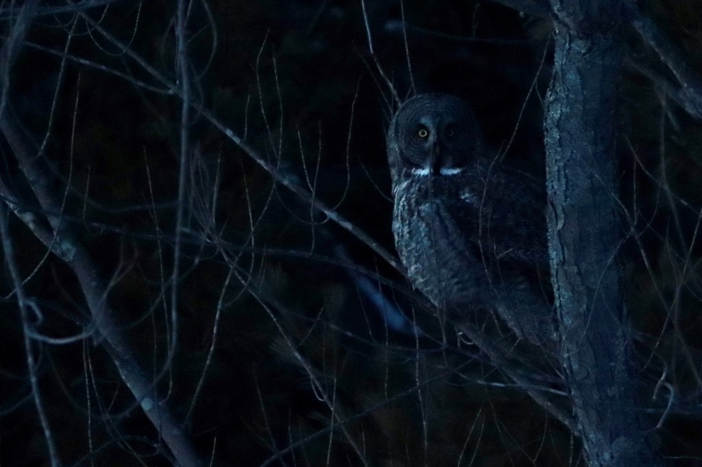 When we are quiet and still, magical moments can appear when we least expect them to. After months of looking for owls, a Great Gray Owl posed for some photos when I went for a walk to watch the sunset.